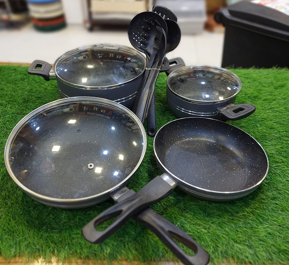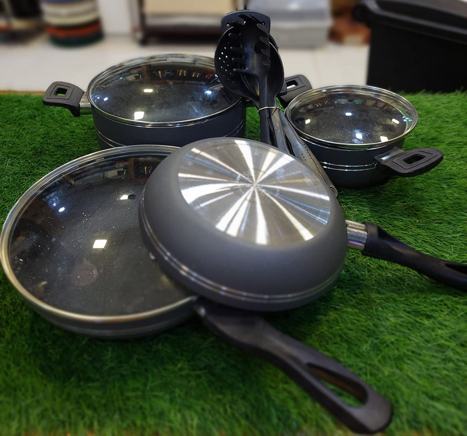 Wave goodbye to tired, flaking cookware with the newly designed Chef Master cookware collection from Delcasa. From casseroles to pans and turners, the 10-piece non-stick granite cookware set with a forged aluminum body is the smart choice for a starter home. The 10-piece set includes a 30x12.8cm casserole with a lid; a 24x10cm casserole with a lid; a 20x9cm casserole with a lid; a 24x4.7cm fry pan with a lid; a 16x7cm saucepan with a lid; and a nylon turner. With a forged aluminum body and granite coating, this nonstick cookware is made of five durable layers, with a body thickness of 2.5 mm and an edge thickness of 4.0 mm. The scratch-resistant coating is super durable, keeping your casseroles and pans looking and feeling newer for longer. High thermal resistance and durability enable years of healthy and fast cooking. The flat induction bottom ensures an even distribution of heat and fast cooking. The set is easy to clean and can be washed in a dishwasher. Featuring an elegant grey color, a modern design, and long-lasting durability, the set makes a thoughtful gift. Inspire the inner chef in you, get that apron on with this stylish beginner cookware set, and prepare healthy and delicious meals at home.