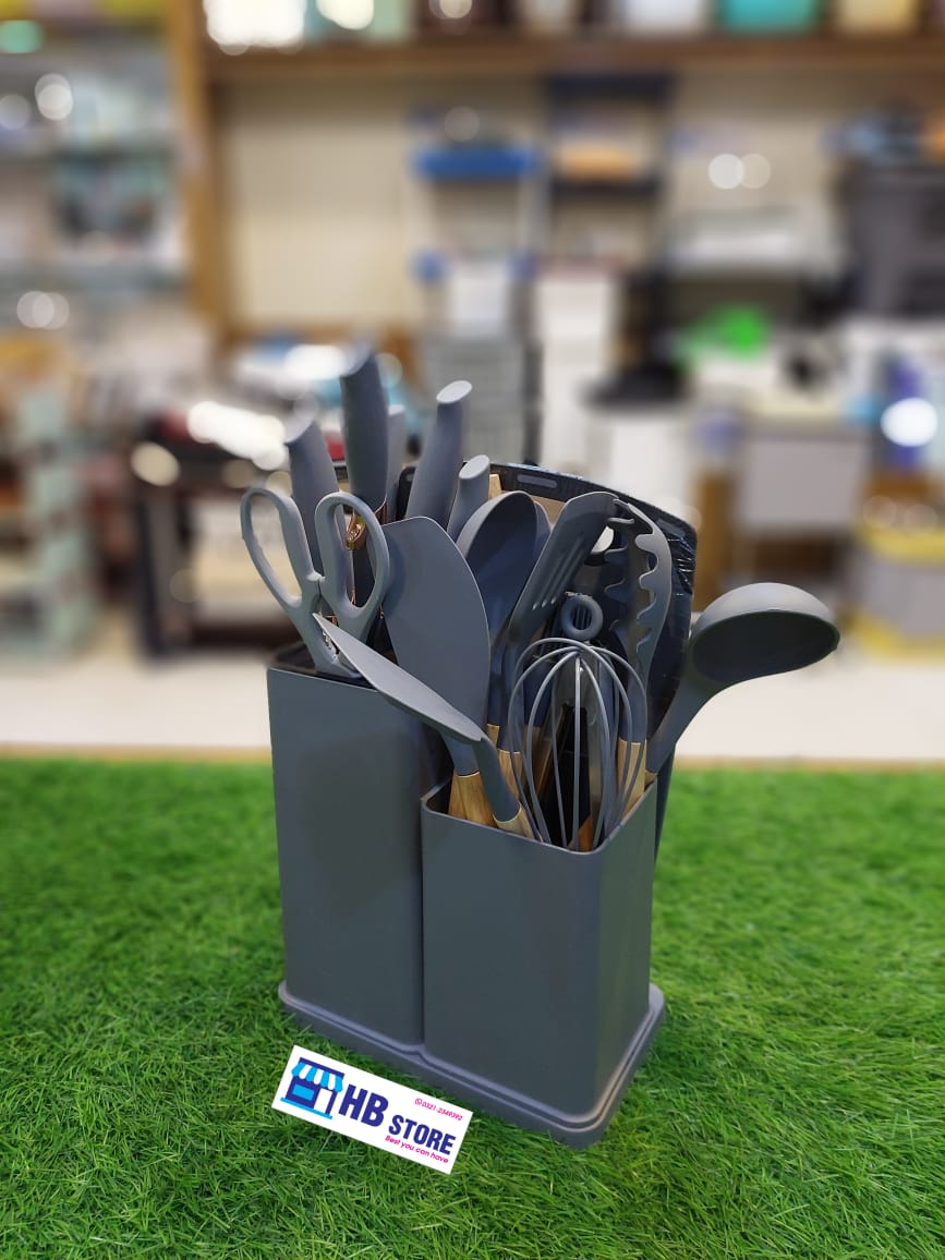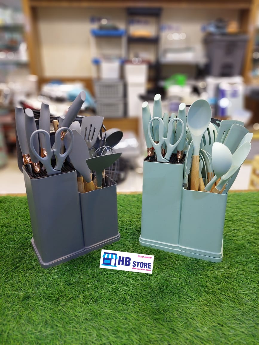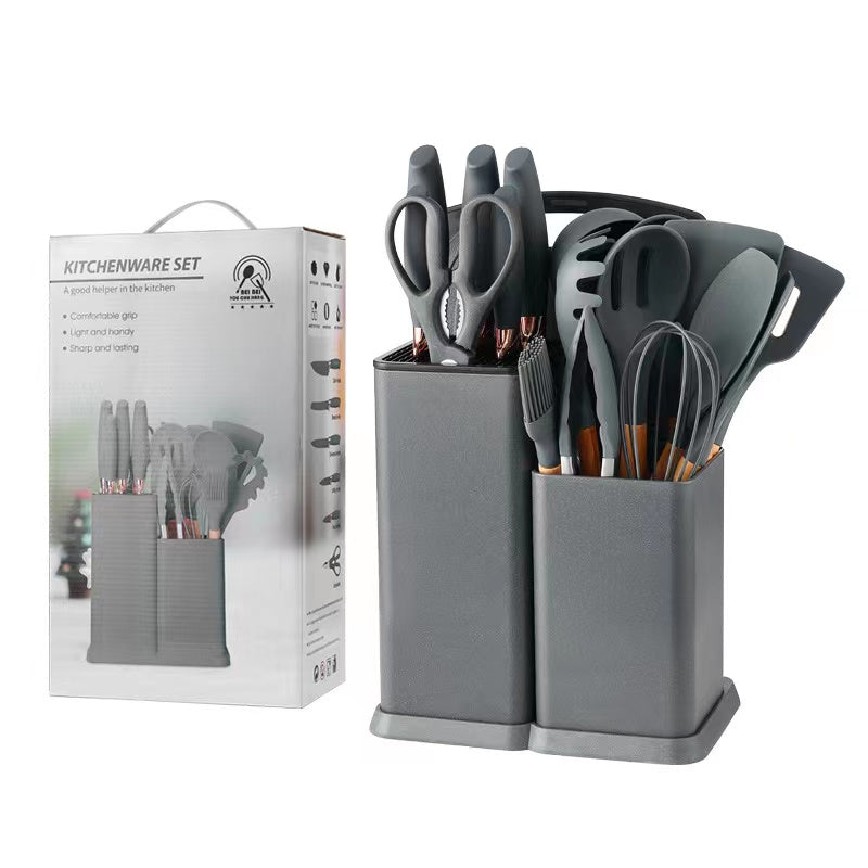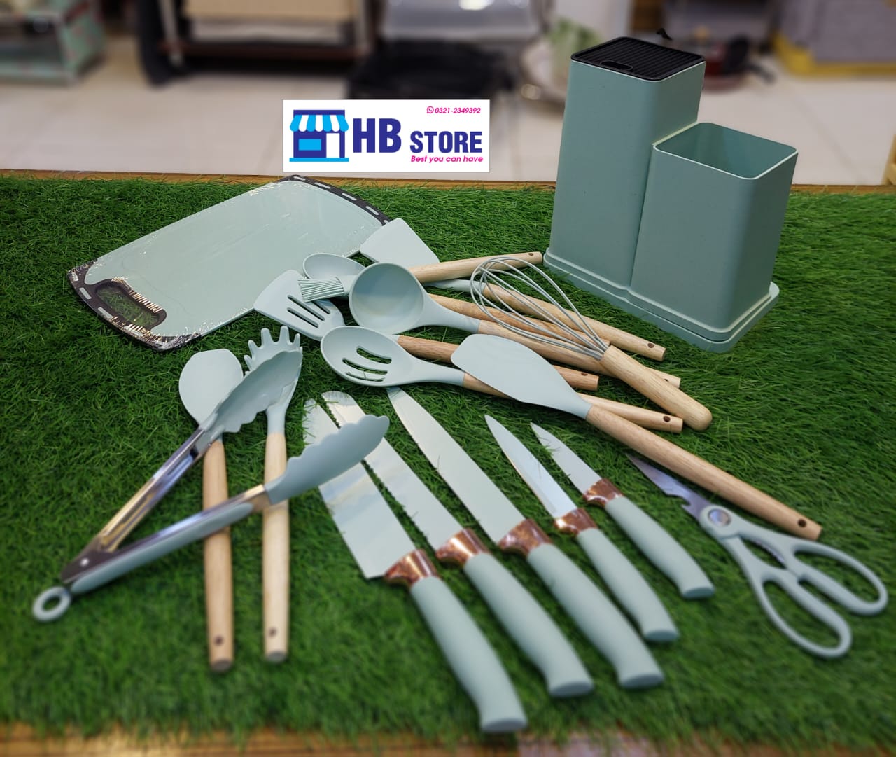 -Material: Silicone and Bamboo-Non stick and heat resistant. Quantity: 19 pieces. -Beater of eggs -Brush. -Shell. -Spatula. -Spatula leaked. -Round spatula. -Tough spatula. -Spoon. Spoon leaked. -Noodle-taker. Catcher. Chef's knife. Knife for Bread. -General-Cut Knife. -Knife for vegetables. -Knife for Fruit. -Scissors. -Cutting board. -Tools and knives holder.