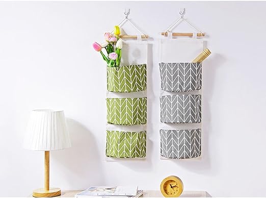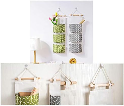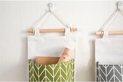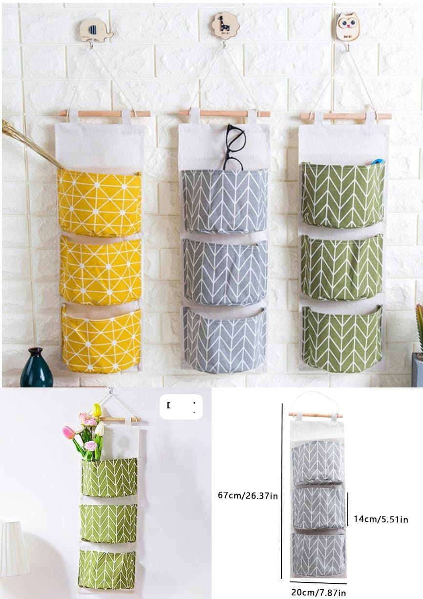 [Save space]: Designed with 3 pockets to storage things such as cell phone, remotes, glasses, jewelry, chap stick, socks, chargers, mail, bills, keys and other small items. Equipped with wooden bar and cotton rope, makes it easy to hang on bedroom, bathroom, kitchen, office.