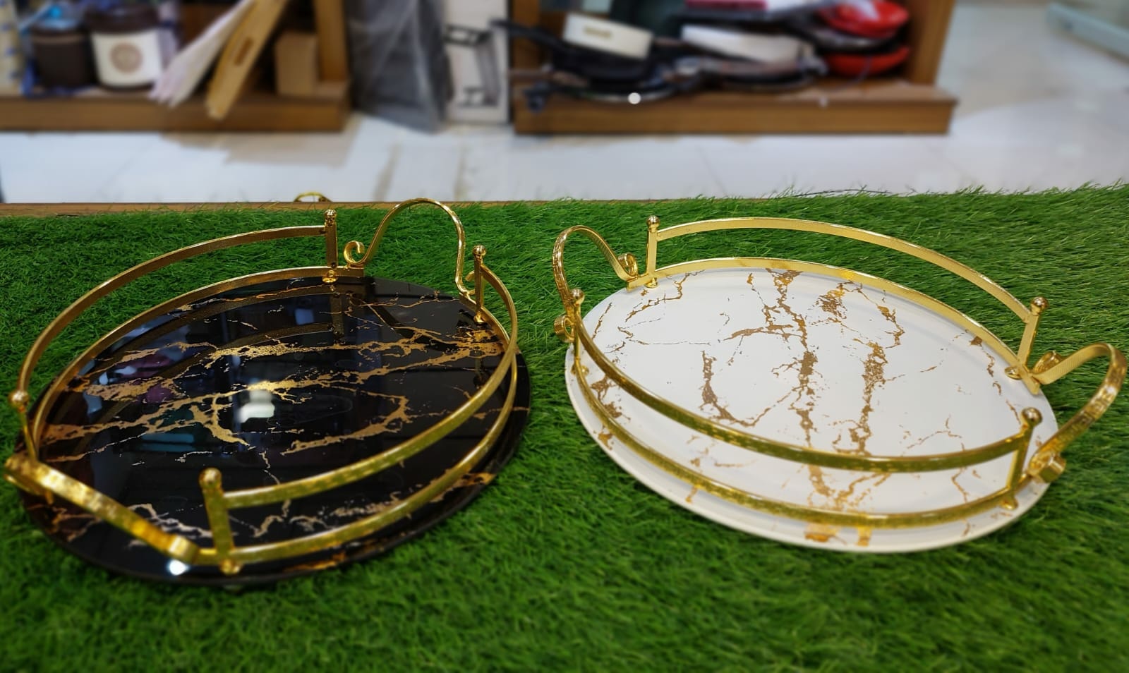 Classy & Stunning - Creative Geometric Wire Bracket in shiny gold + Glass Tray with elegant golden black marbling pattern, a definitely gorgeous makeup tray can perfectly fit with various items, adding a special & modern touch. Versatile Vanity Tray - Designed for display and storage, this marbling makeup organizer can be used as a perfume tray, jewelry tray, bathroom tray, decorative tray even a desk organizer tray. Metal + Glass - Plated wire bracket enhances its stability & sturdiness. Nice Size -It greatly blend into small or bigger tables, large enough to decently display makeups, perfumes, jewelries, toiletries, candles and decors while still space-saving. Useful for All Occasions - An eye-catching cosmetic organizer for dresser and bathroom counters, also a great decorative desk centerpiece for ottoman, nightstand, coffee table, dining table and parties like Christmas, birthday, wedding, baby shower. Storage Function: Make good use of the empty place on the table and create a warm home style space to organize your cosmetics, books and magazines or as a cupcake tray for your party with this elegant shaped desktop organizer Home Decor: Designed with iron frame, the shelf can not only upgrade your household style but also fitting for all rooms decoration.