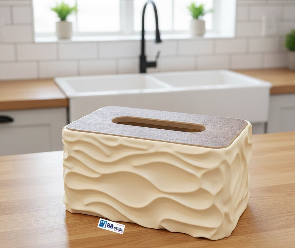 This premium tissue box features a unique, 3D wave-textured body crafted from high-quality ceramic. The fluid, organic lines provide a tactile and visual depth that catches the light beautifully, especially in bright kitchen or bathroom settings.