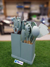 -Material: Silicone and Bamboo-Non stick and heat resistant. Quantity: 19 pieces. -Beater of eggs -Brush. -Shell. -Spatula. -Spatula leaked. -Round spatula. -Tough spatula. -Spoon. Spoon leaked. -Noodle-taker. Catcher. Chef's knife. Knife for Bread. -General-Cut Knife. -Knife for vegetables. -Knife for Fruit. -Scissors. -Cutting board. -Tools and knives holder.