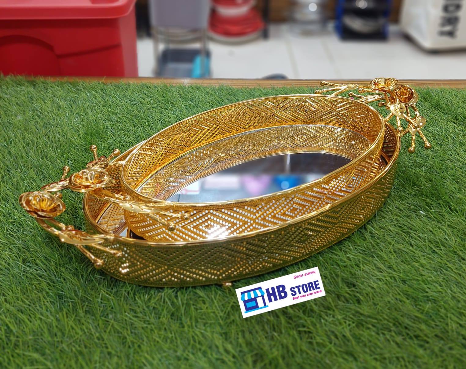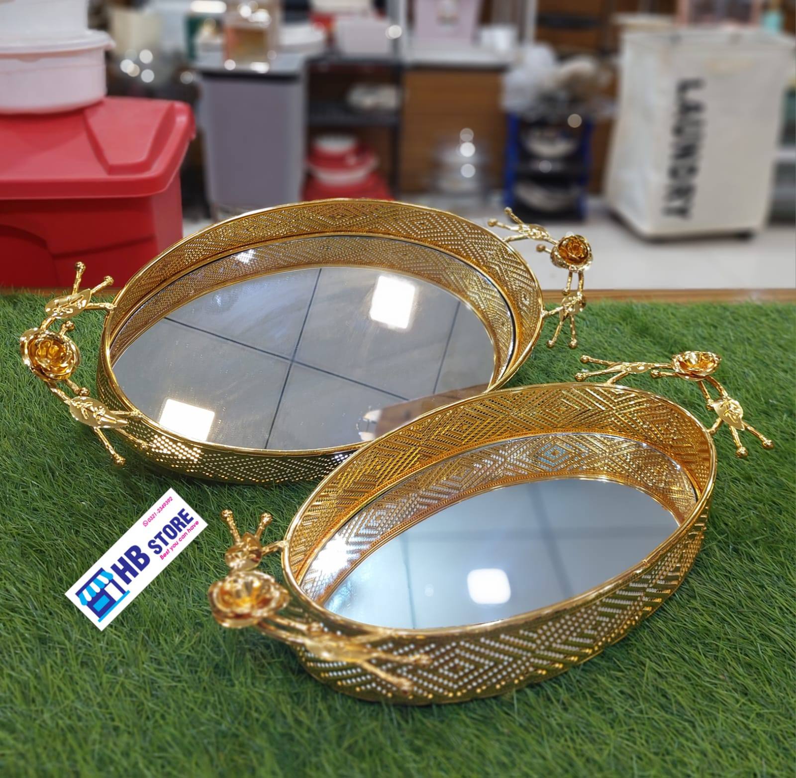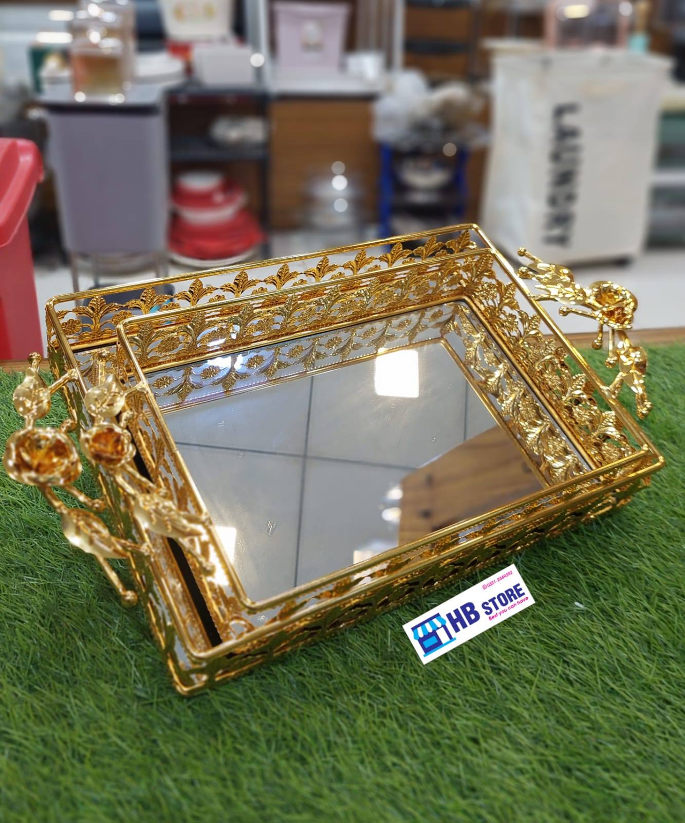 Luxury Decorative Gold Mirror Trays are made of metal and finished with an elegant mirrored glass surface, which is elegant and sturdy. The intricate detailing and vintage aesthetic of this tray make it a standout piece that adds a touch of elegance and charm to any space.