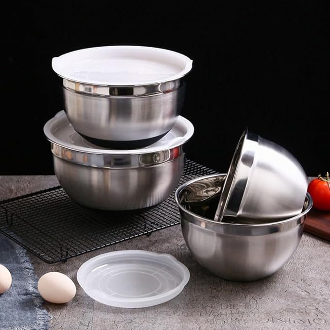 【Widely Used】 -This Stainless Steel Bowls for food storage, baking and cooking preparation. These brushed-metal bowls comeVarious Size. Wide, flat rim ensures a sturdy grip for pouring, mixing, whisking, meal prepping, and serving.
