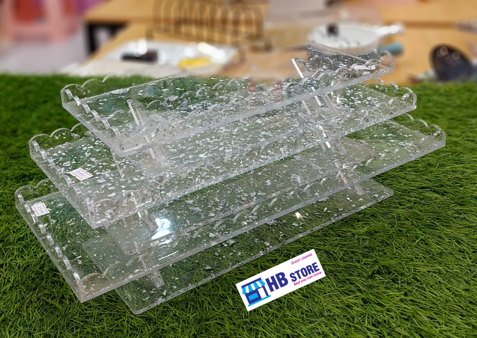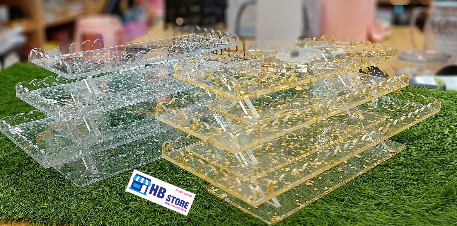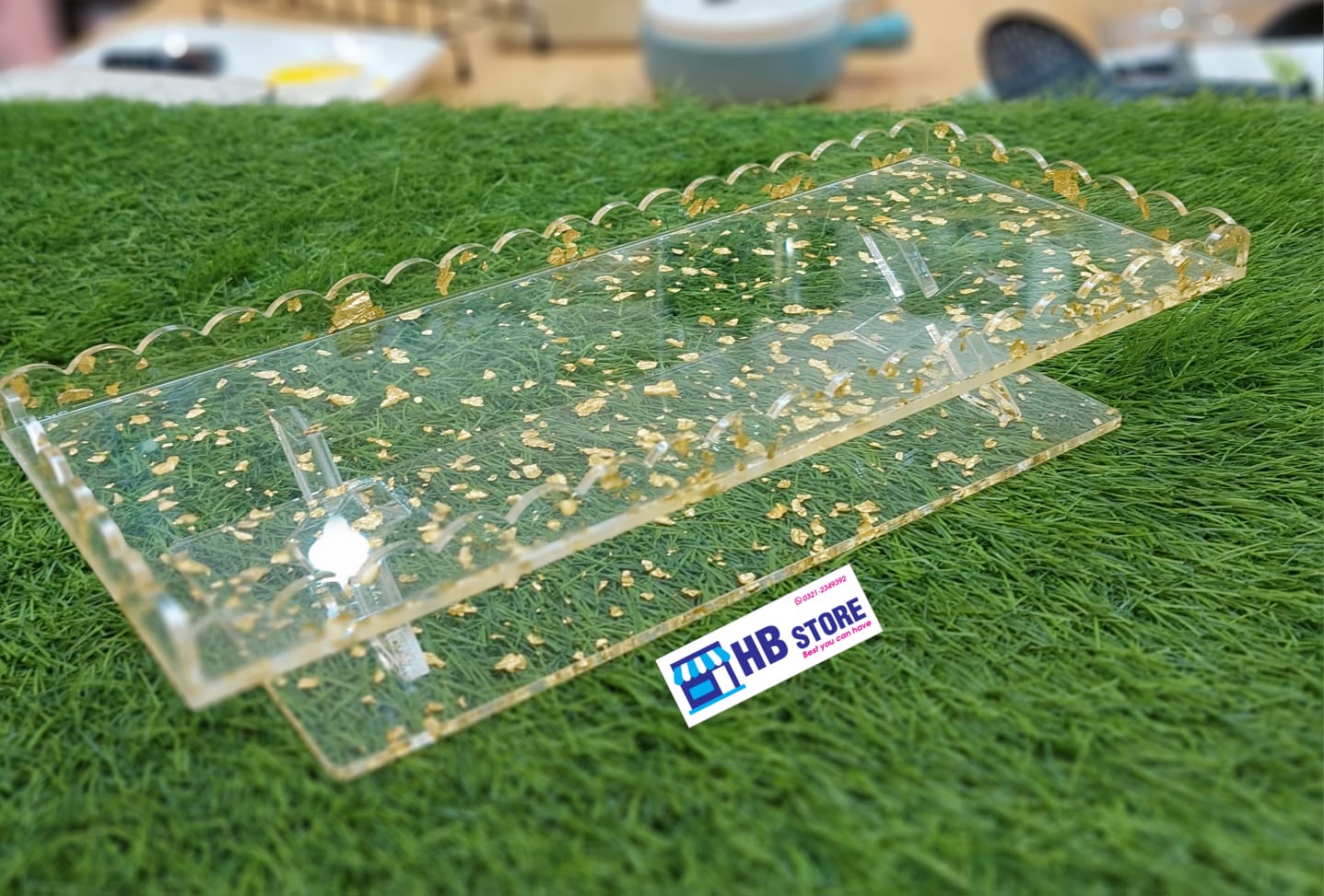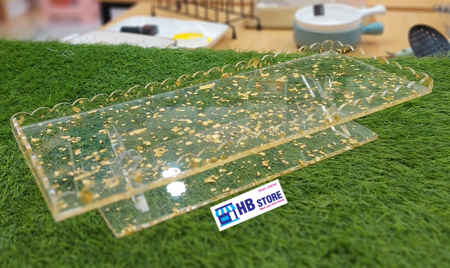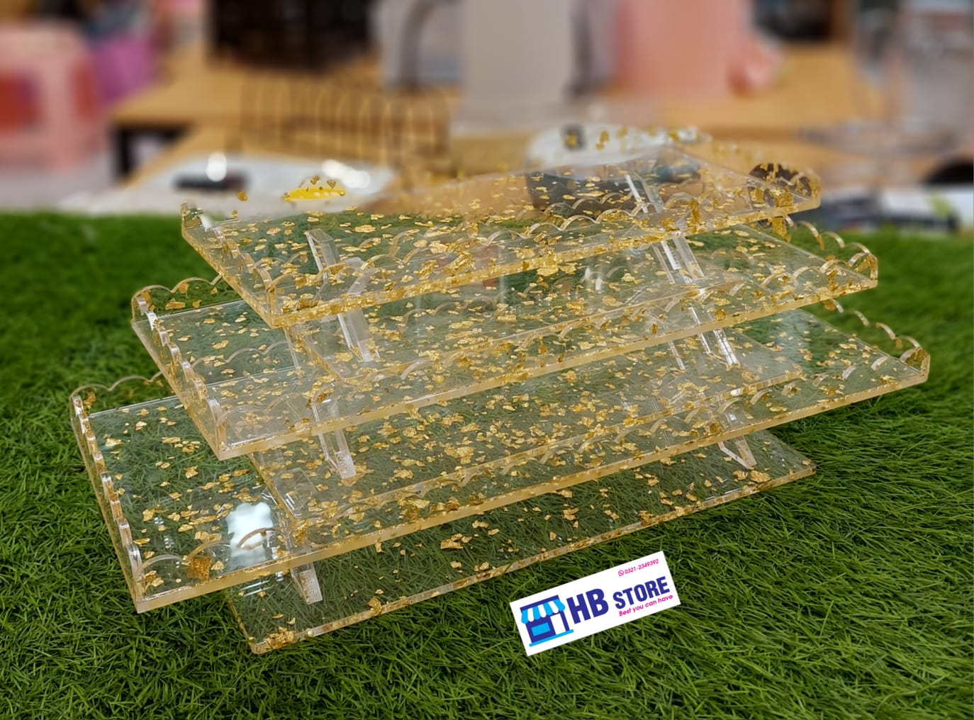 Elevate your table setting with this stunning acrylic buffet trays, beautifully designed with embedded gold and silver foil flakes. Perfect for weddings, parties, or special events, these trays offer a luxurious and elegant way to display desserts, appetizers, or snacks. The durable, clear acrylic construction ensures lasting use while showcasing your treats in style. Whether you're hosting a celebration or decorating a buffet table, this versatile and eye-catching display stand adds a touch of glamour to any occasion. 💫