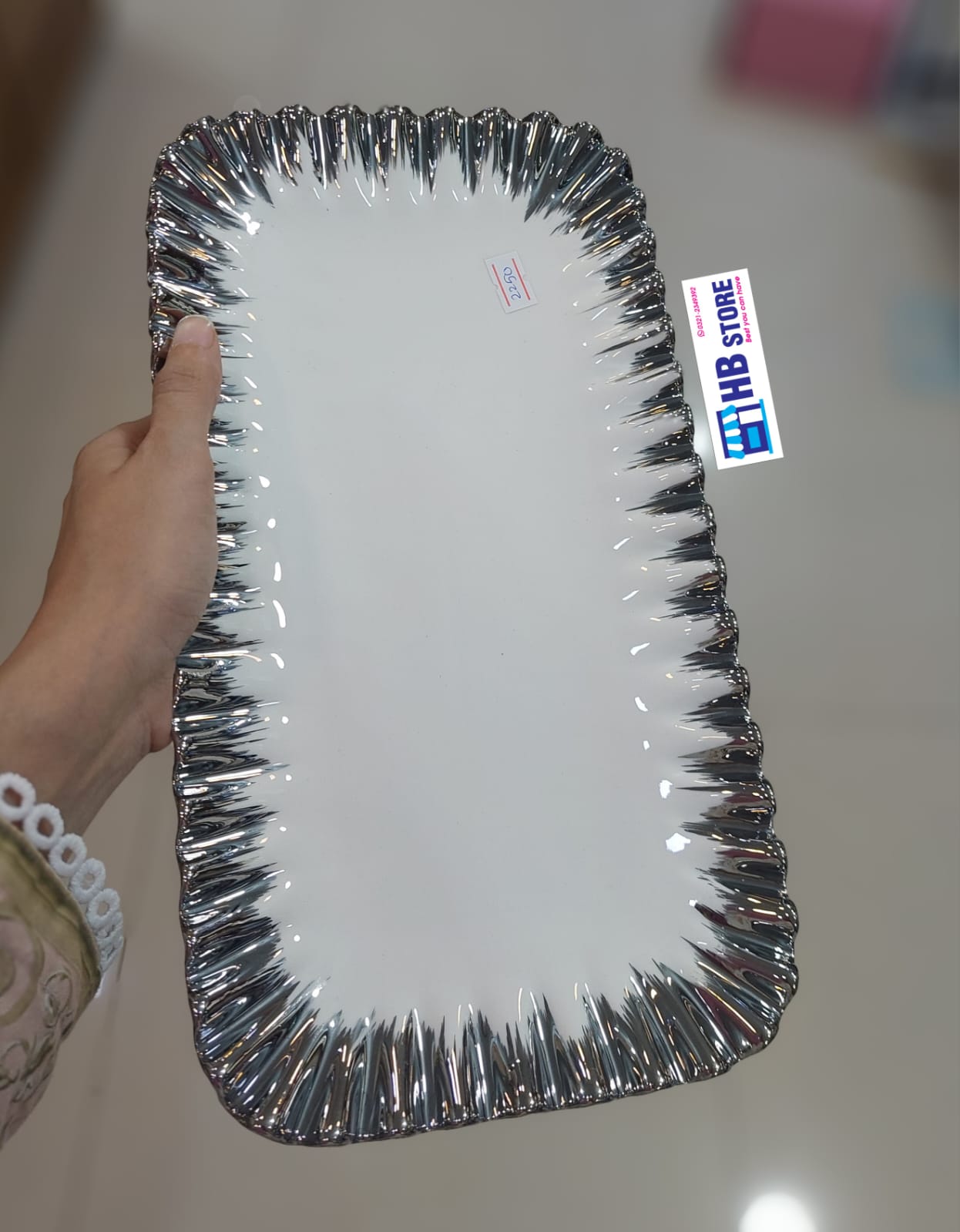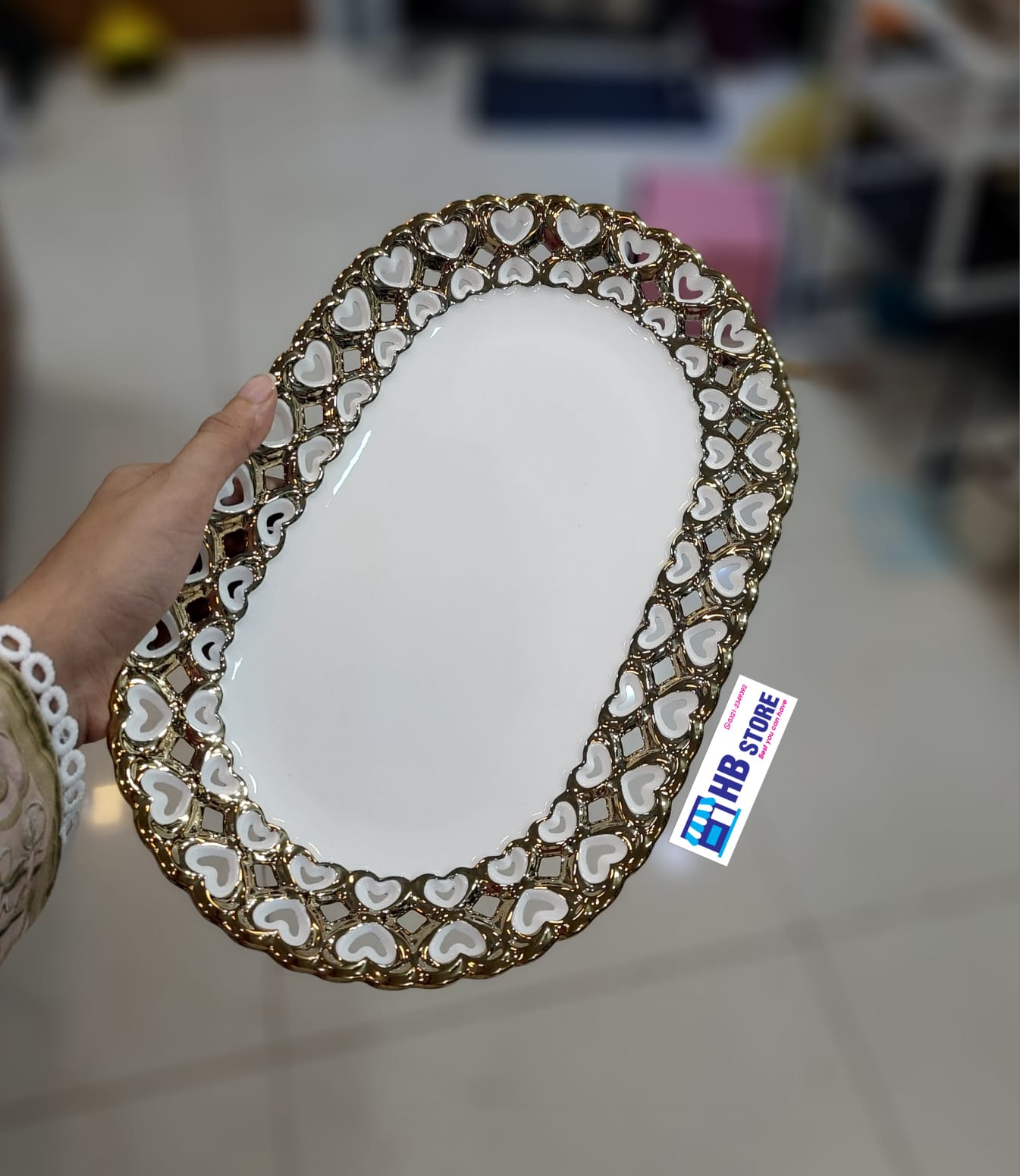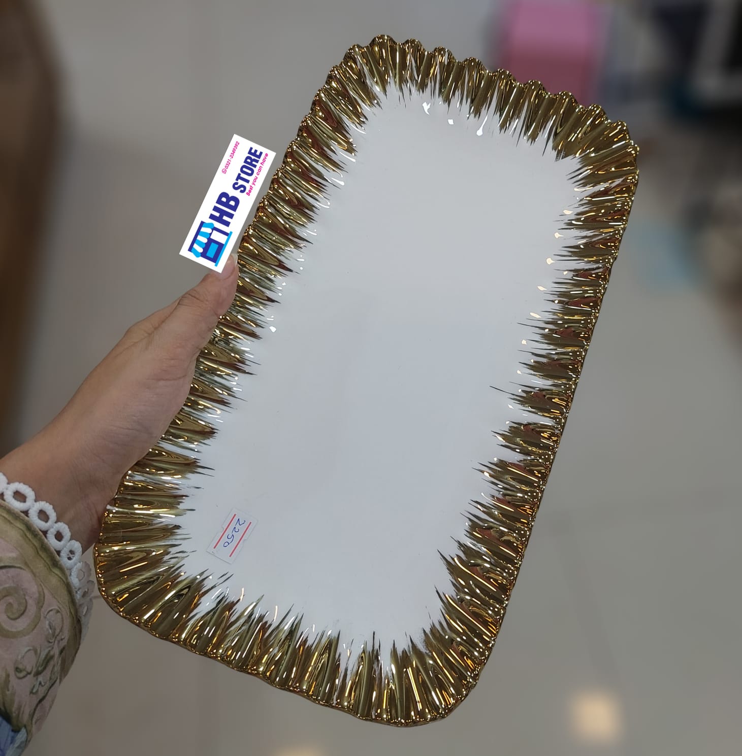 This Royal Serving Platter is a beautiful addition to your serveware collection. Made of high-quality ceramic, it features frilled edges with golden and silver borders that add a touch of elegance to any table setting. Perfect for serving desserts and candies, this platter is both functional and stylish. With express delivery available in Karachi, you can have this stunning piece in your hands in no time. Ideal for special occasions or everyday use, this serving platter is a must-have for any kitchen and dining setup.