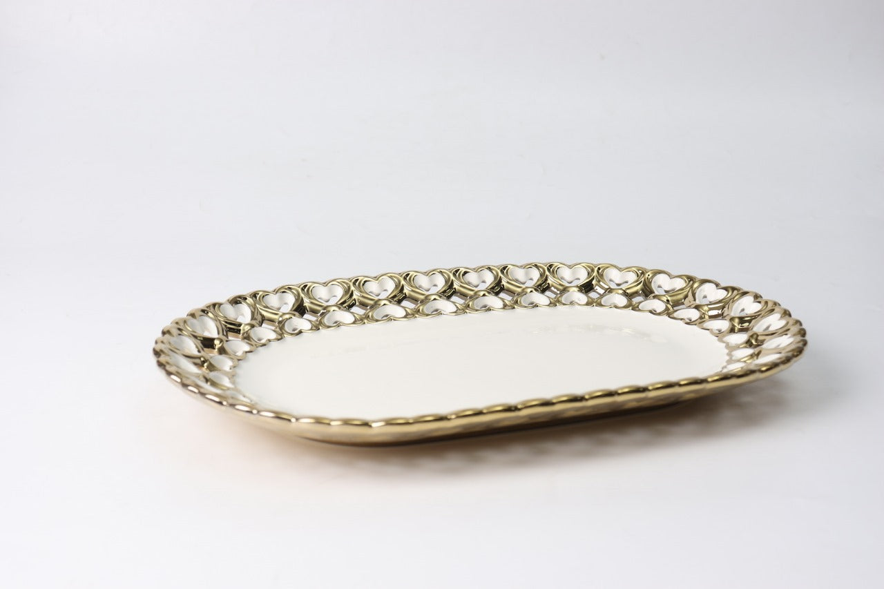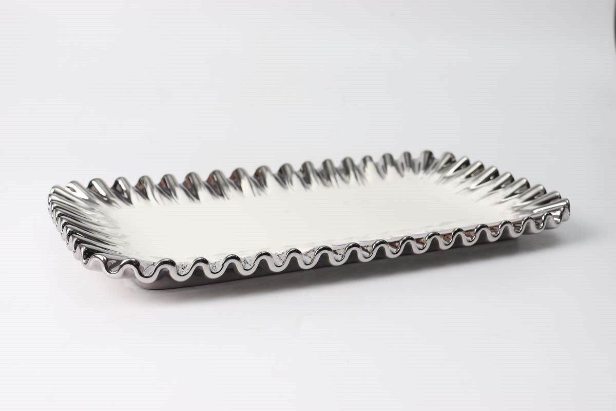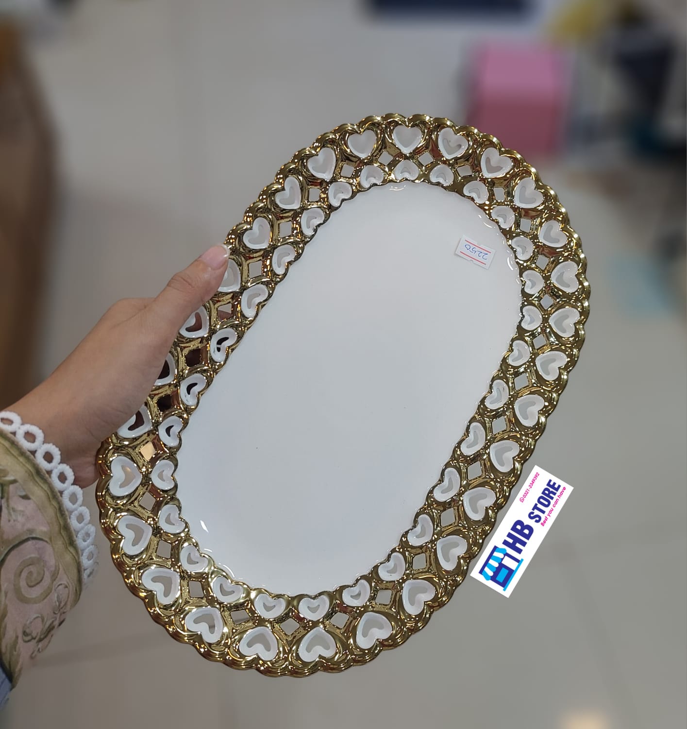 This Royal Serving Platter is a beautiful addition to your serveware collection. Made of high-quality ceramic, it features frilled edges with golden and silver borders that add a touch of elegance to any table setting. Perfect for serving desserts and candies, this platter is both functional and stylish. With express delivery available in Karachi, you can have this stunning piece in your hands in no time. Ideal for special occasions or everyday use, this serving platter is a must-have for any kitchen and dining setup.