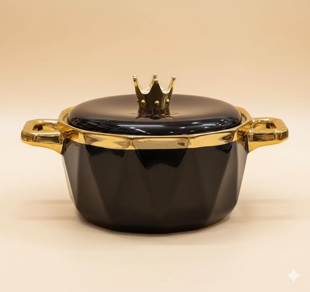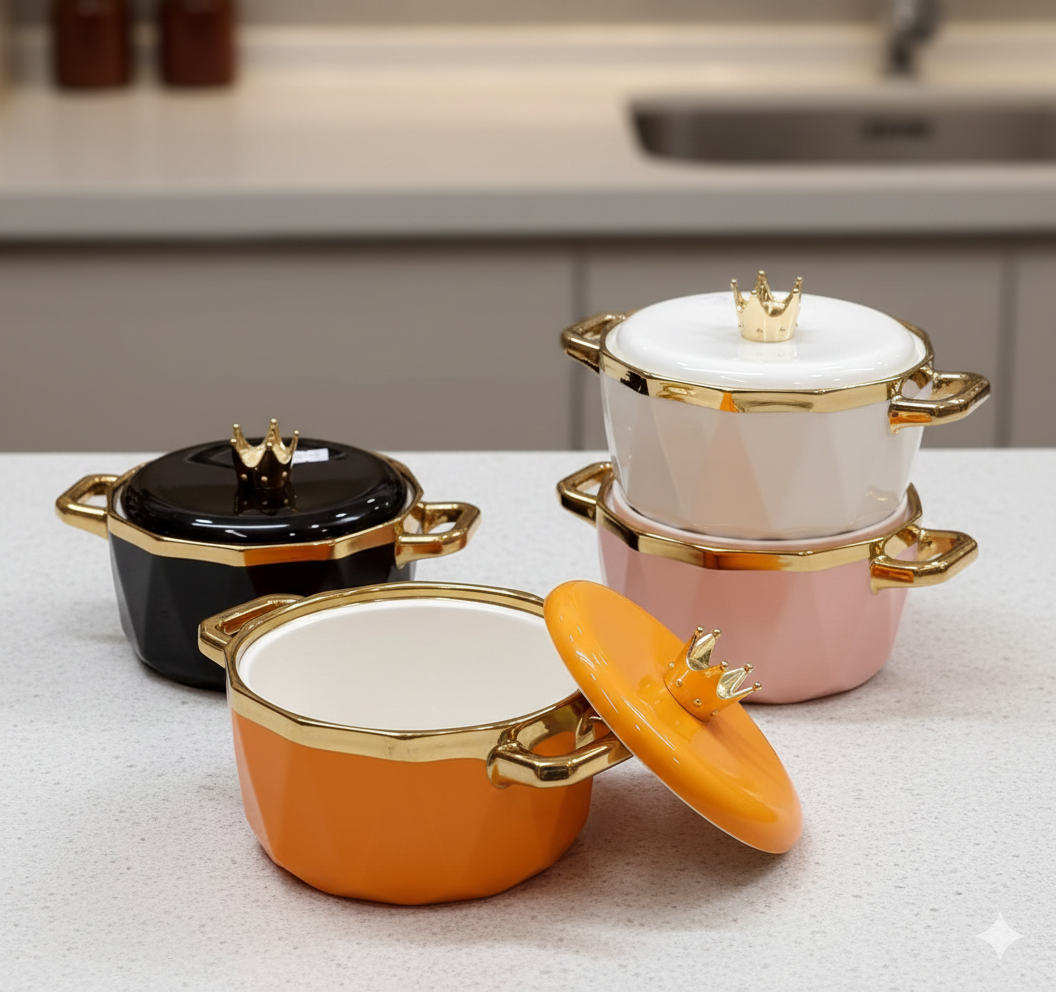 Treat your guests like royalty with our Crown Series Ceramic Bowls. Featuring a sophisticated geometric faceted body and a stunning gold-finished rim, these bowls are topped with a whimsical golden crown handle that makes every serving feel like a special occasion.