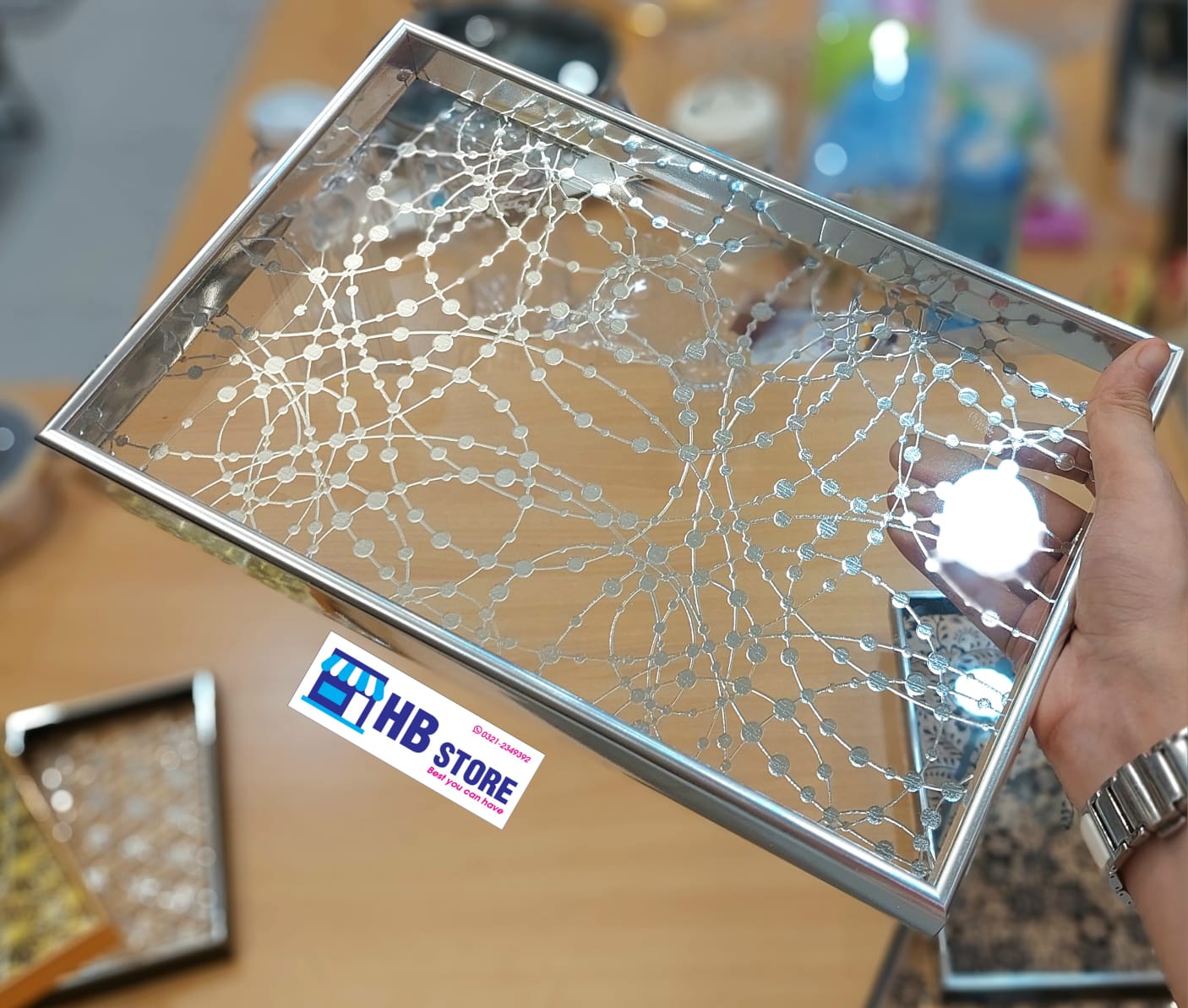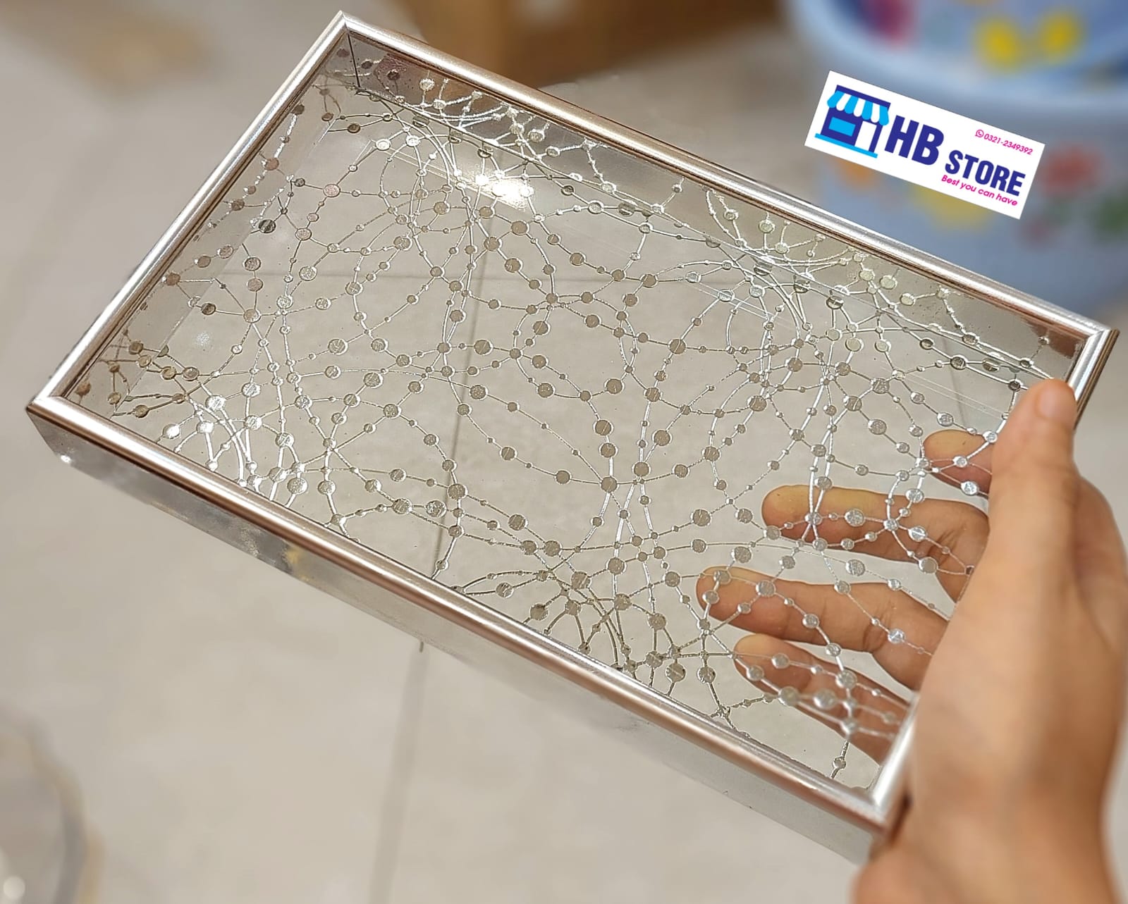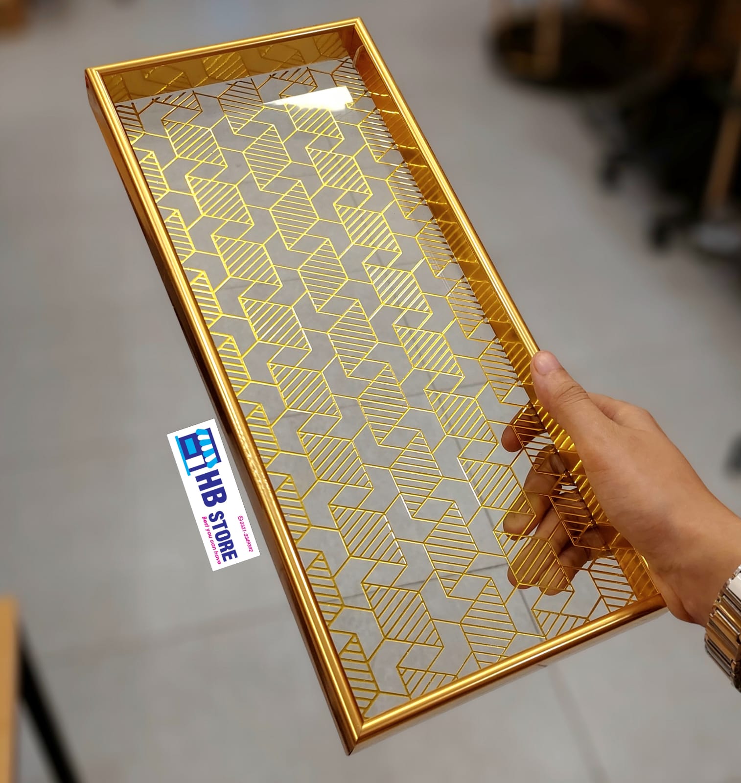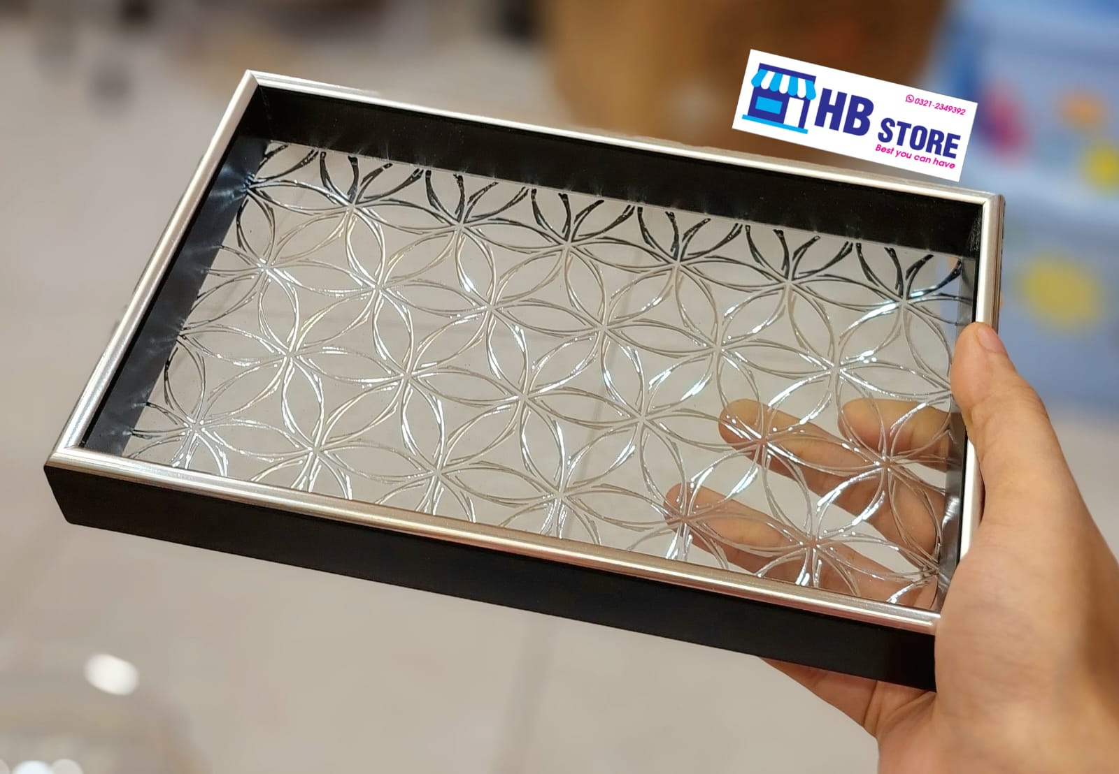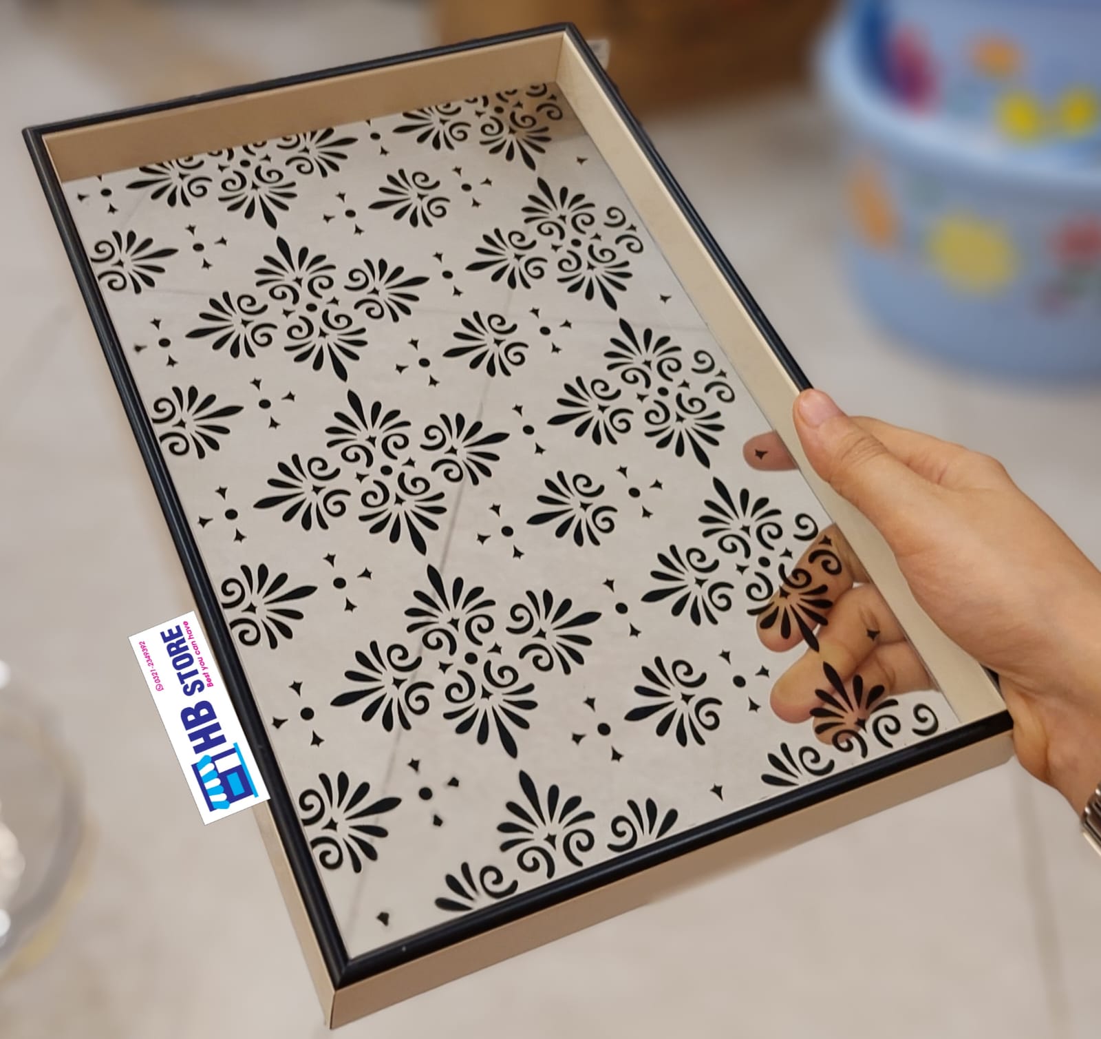 "Your home deserves décor as unique as you. Choose from 3 sizes × 4 colors in this elegant Arabic‑style acrylic tray."