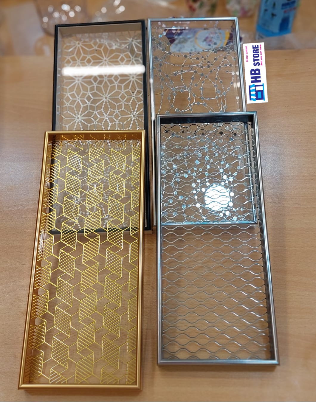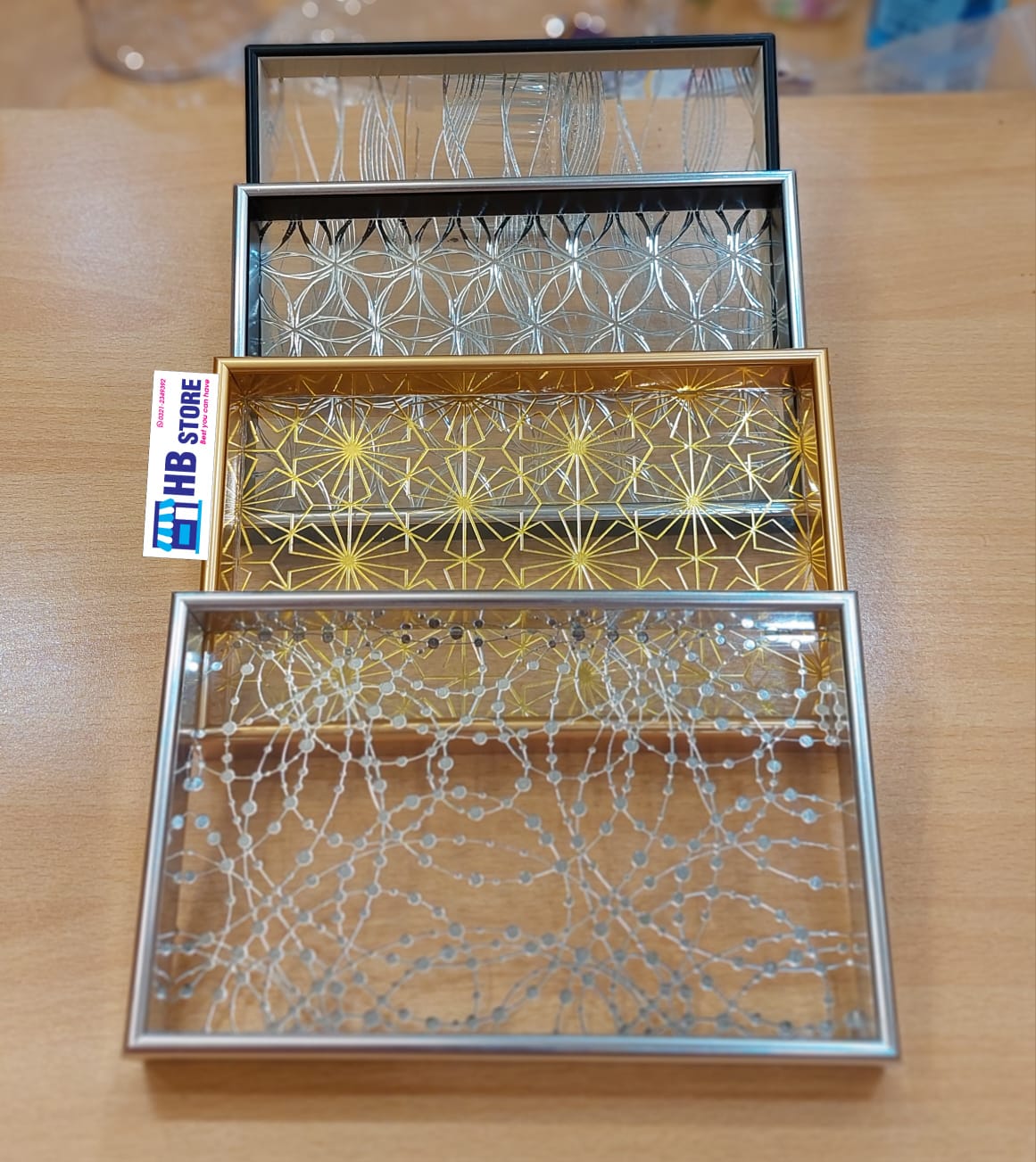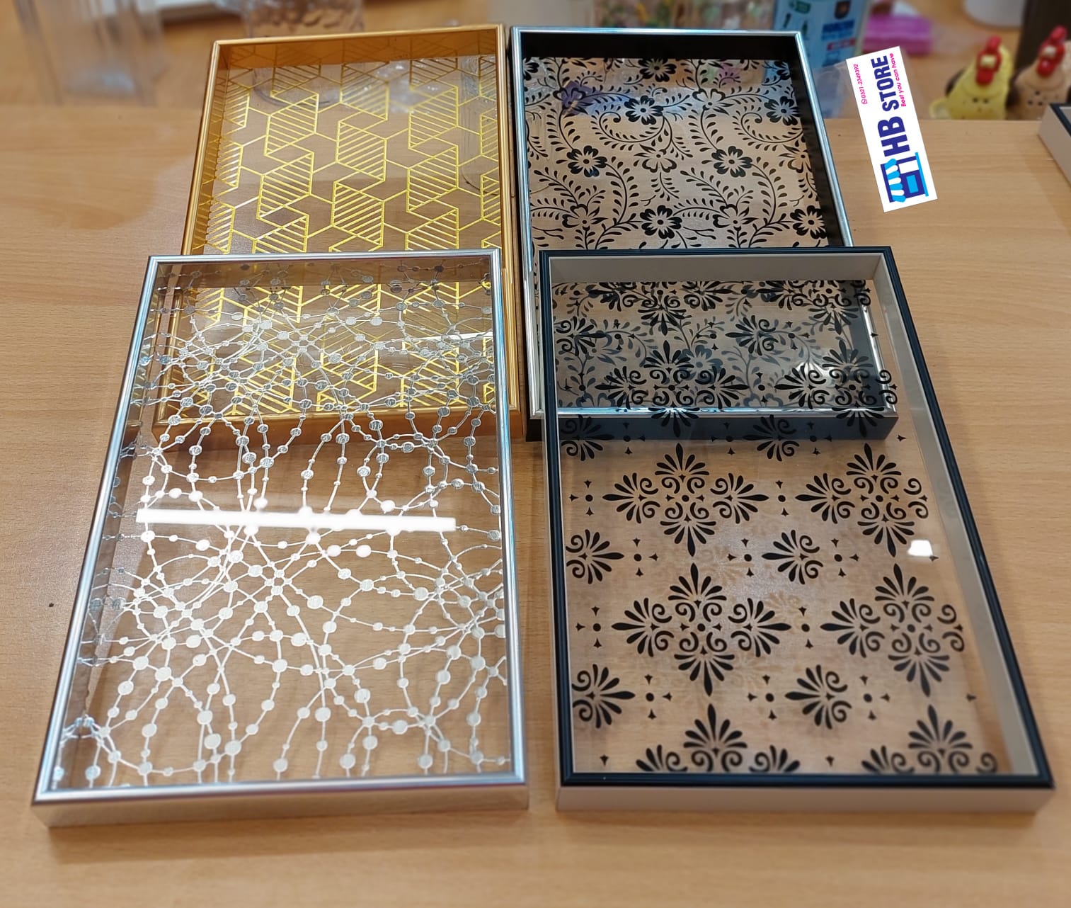 "Serve, display, inspire. Our Arabic‑pattern acrylic trays in 3 sizes & 4 colors are crafted for every occasion."
