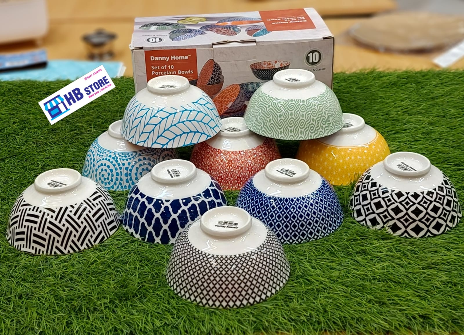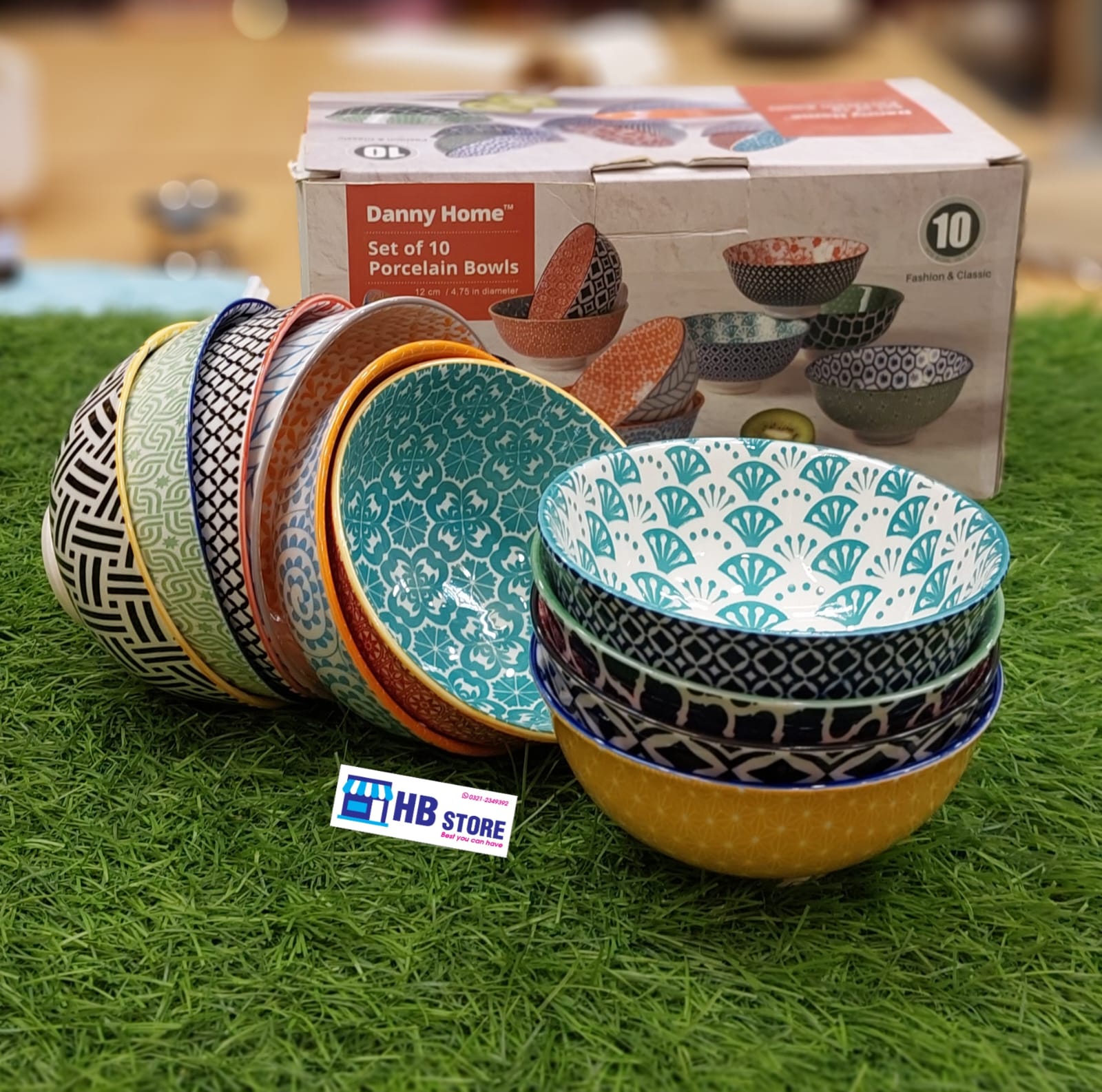 Bring a vibrant, global, and eclectic flair to your table with this stunning Set of 10 Assorted Porcelain Bowls by Danny Home. Featuring a mix of ten unique, eye-catching patterns and colors—including florals, geometrics, and intricate mosaics—these bowls are perfect for everyday use or adding a cheerful touch to your next gathering.