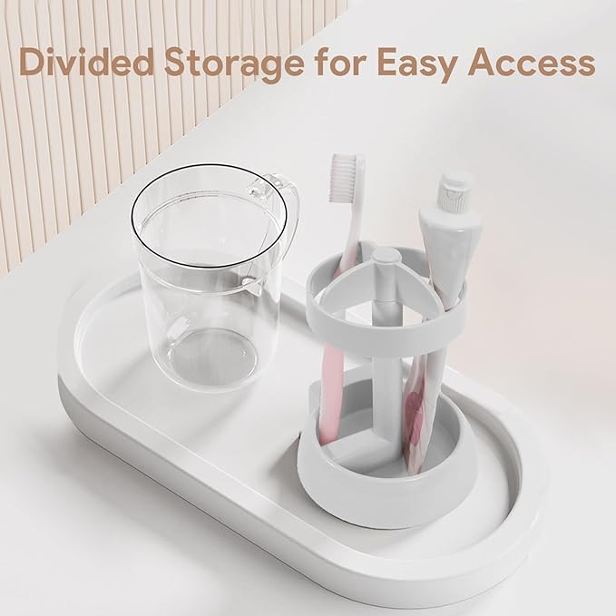 • Space-Saving Design: The bottom tray collects water buildup, keeping your toothbrush head dry. A central divider separates toothpaste and toothbrushes, optimizing space on your vanity countertop.
