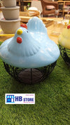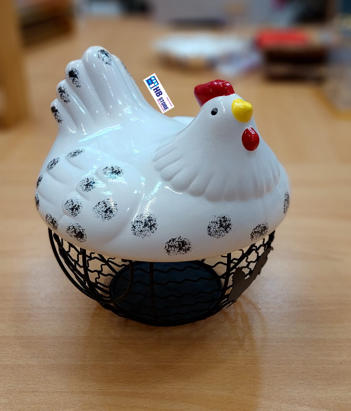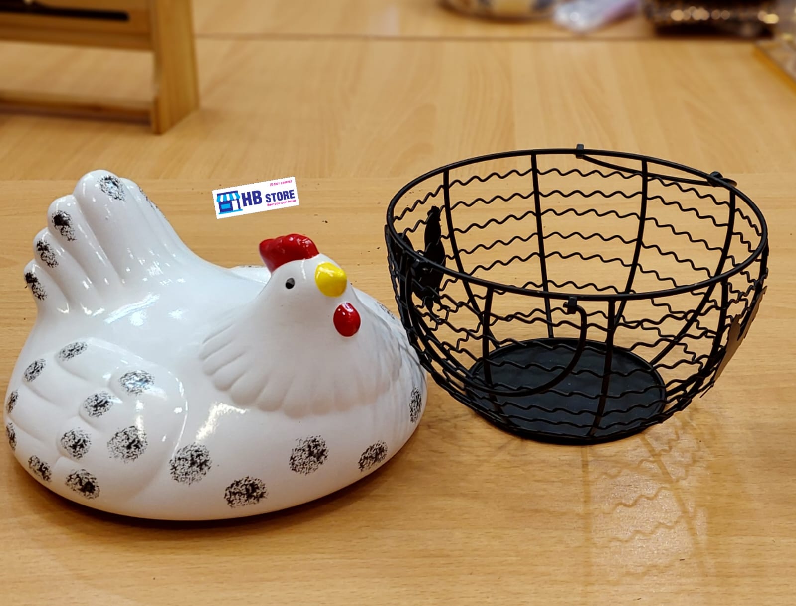 "Add a touch of charm and functionality to your kitchen with this delightful ceramic chicken egg basket from HB Store. Featuring a beautifully crafted white hen with hand-painted black speckles, a bright red comb, and a yellow beak, this farmhouse-inspired piece serves as both a decorative accent and a practical storage solution. The top ceramic portion lifts off to reveal a sturdy black wire basket, perfect for holding eggs or small kitchen essentials. Whether you're organizing your countertop or enhancing your rustic decor, this whimsical hen brings warmth and personality to any space."