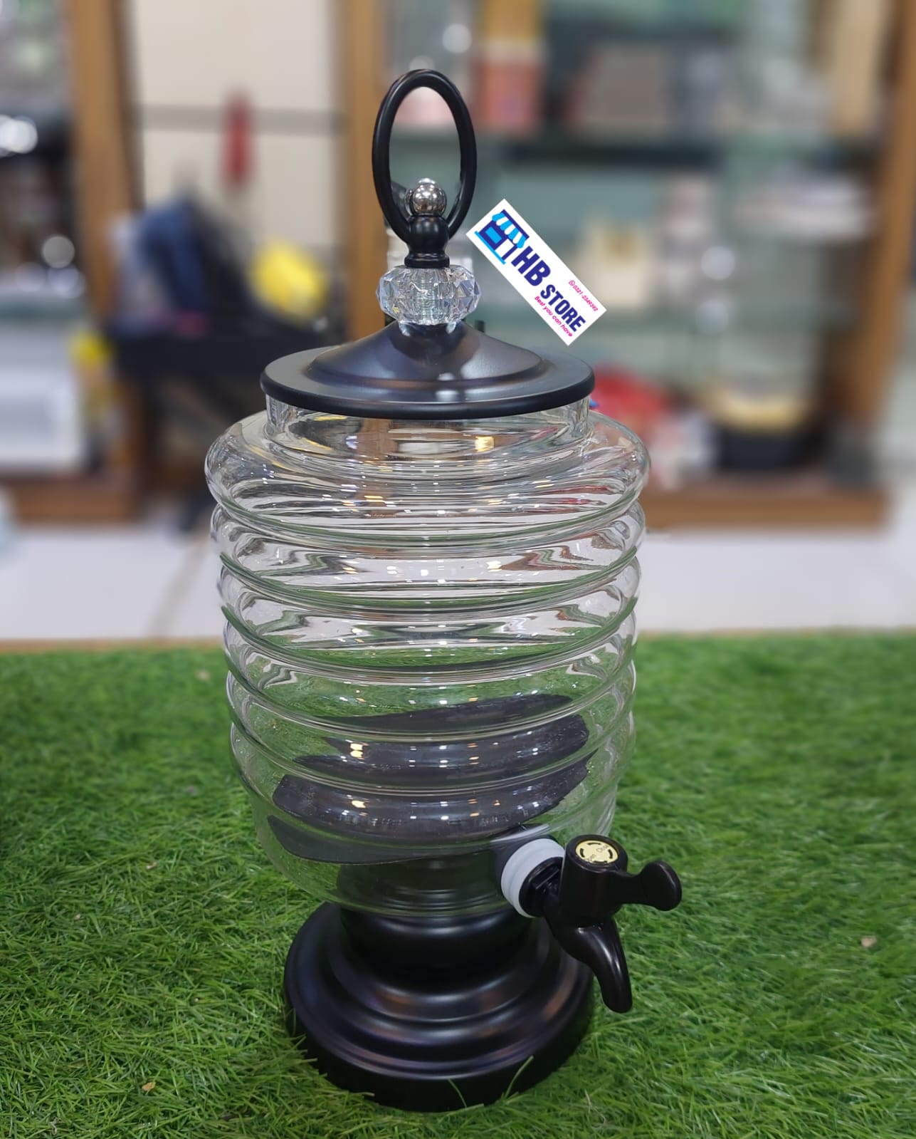 Glass Beverage Dispenser with l Knob, Ribbed Design, Black Base