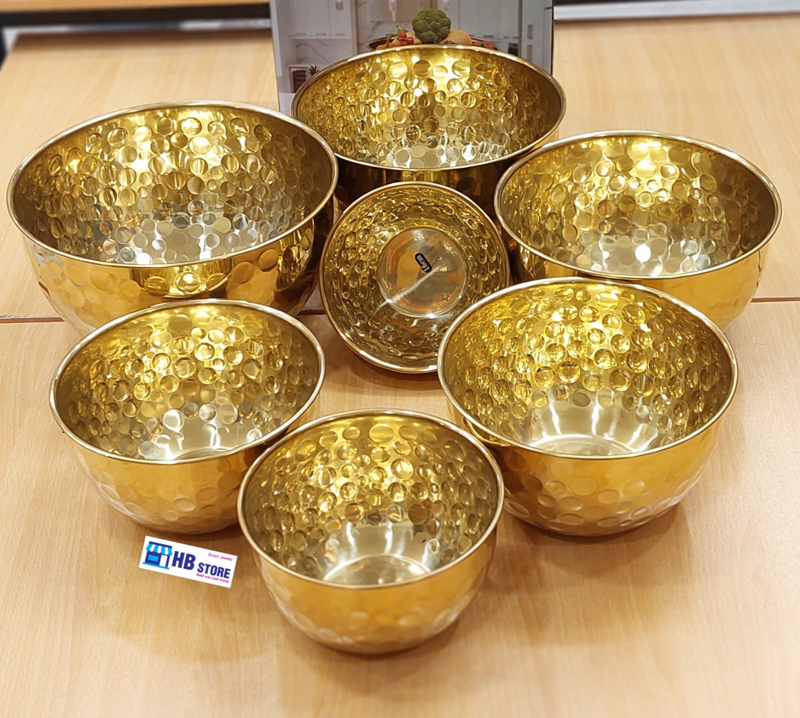 Bring a touch of elegance to your kitchen with these Premium Golden Hammered Bowl Sets, available in 5pcs and 7pcs. Each bowl is crafted with a stunning hammered texture that reflects light beautifully, giving it a rich, luxurious look.