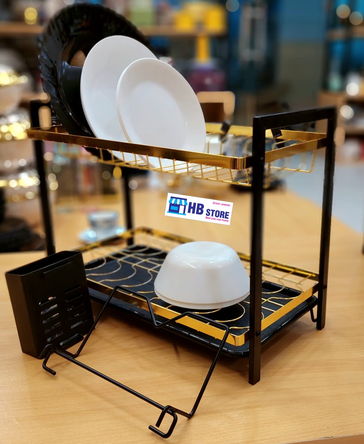 "Elevate your kitchen aesthetic with our black‑and‑gold two‑level dish rack."