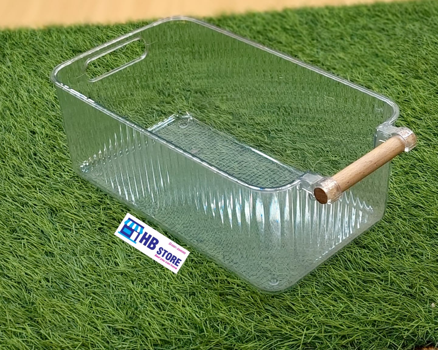 Bring organization and style to any area of your home with these transparent, multi-functional storage bins. Featuring a contemporary ribbed design and contrasting natural wood handles, these containers offer both aesthetic appeal and practical storage solutions.