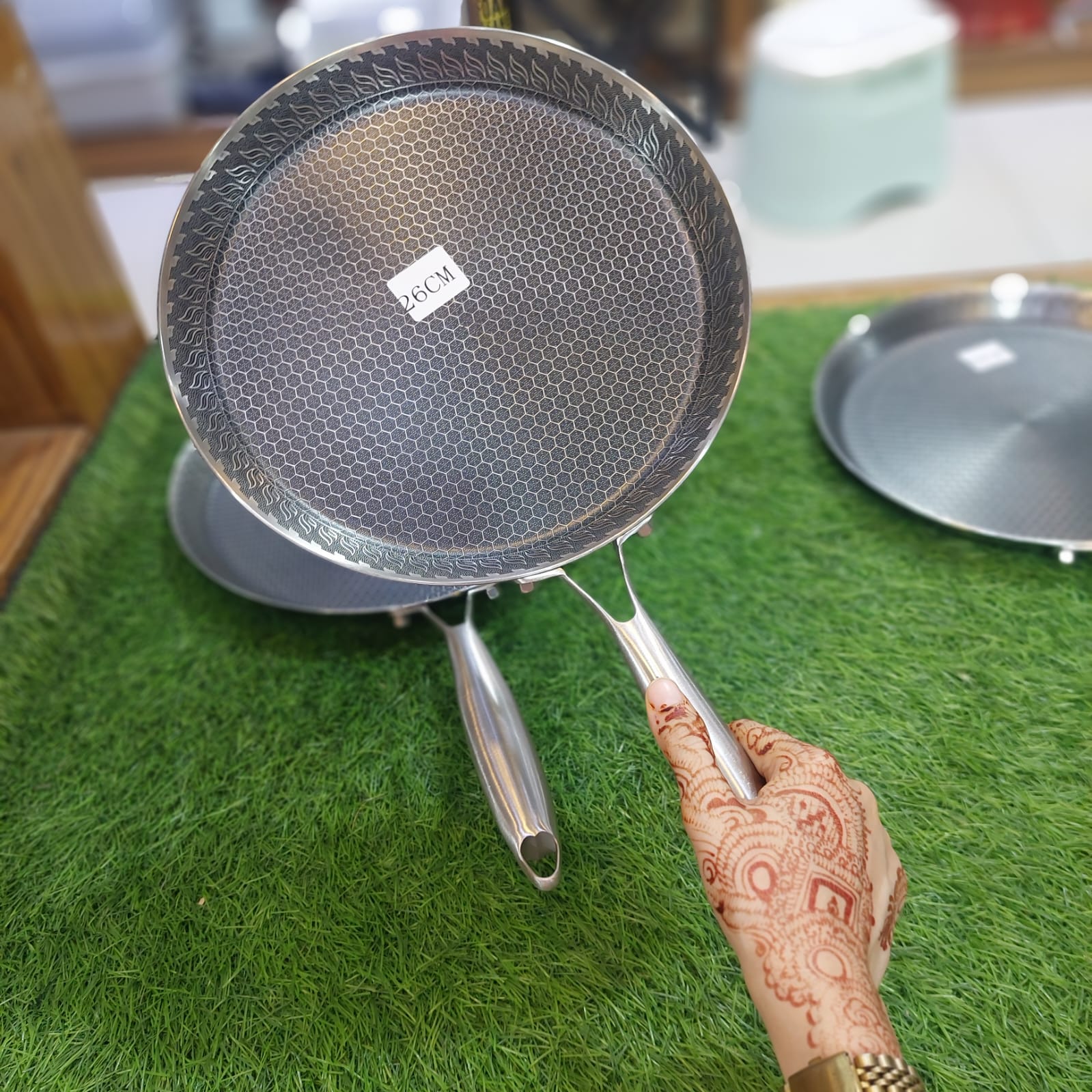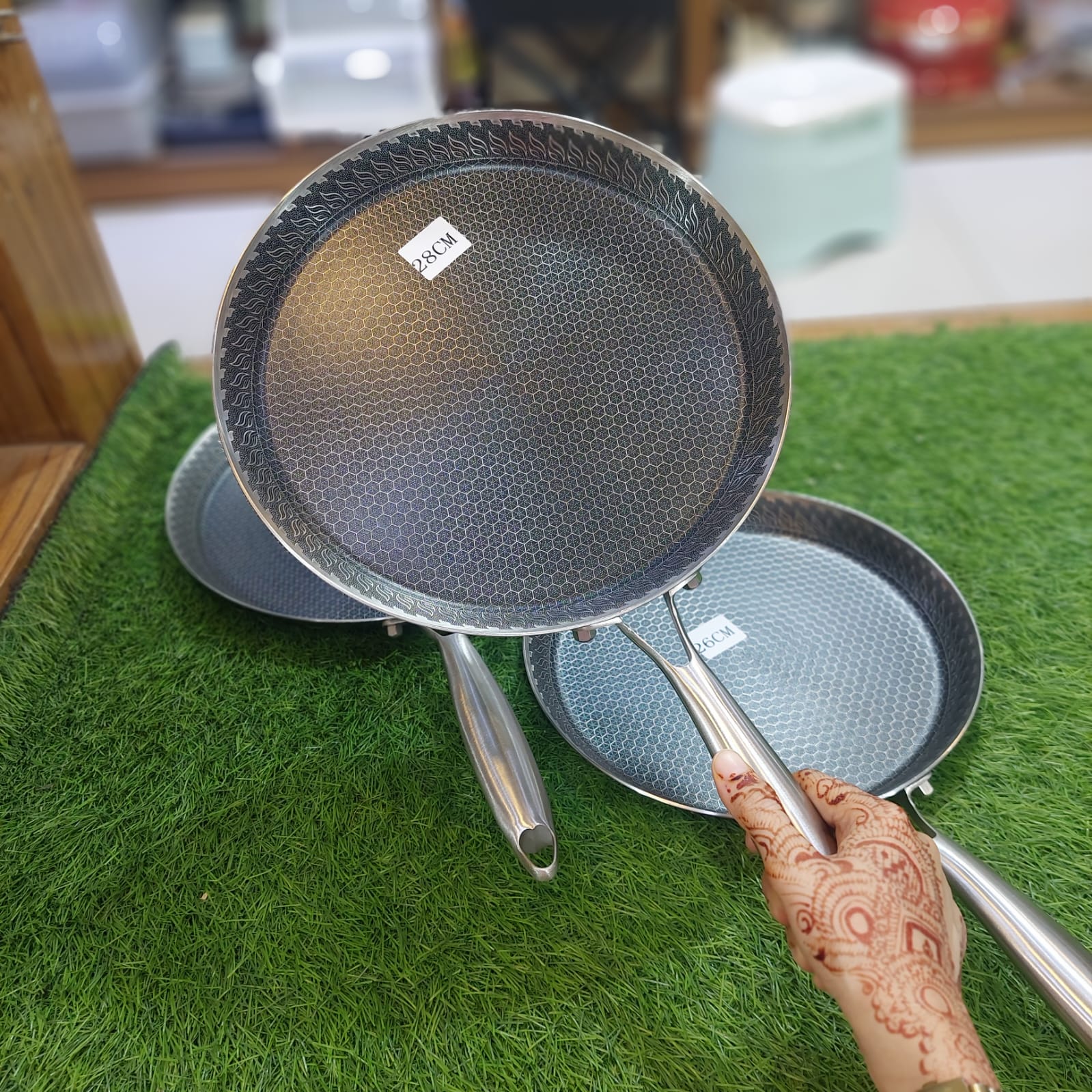 • 【Superior Nonstick Dual Honeycomb Coating】The stainless steel crepe pan adopts a dual honeycomb laser-etched process that combines point and surface textures, makes the entire bottom and side walls of stainless steel pancake pan are covered with micro-convex grain, reducing the contact area between food and the bottom of the nonstick crepe pan, allowing food to suspend on the healthy nonstick coating, improving the nonstick performance of the crepe pan. Even if less oil, The foods slide over smoothly from the surface of dosa pan without effort